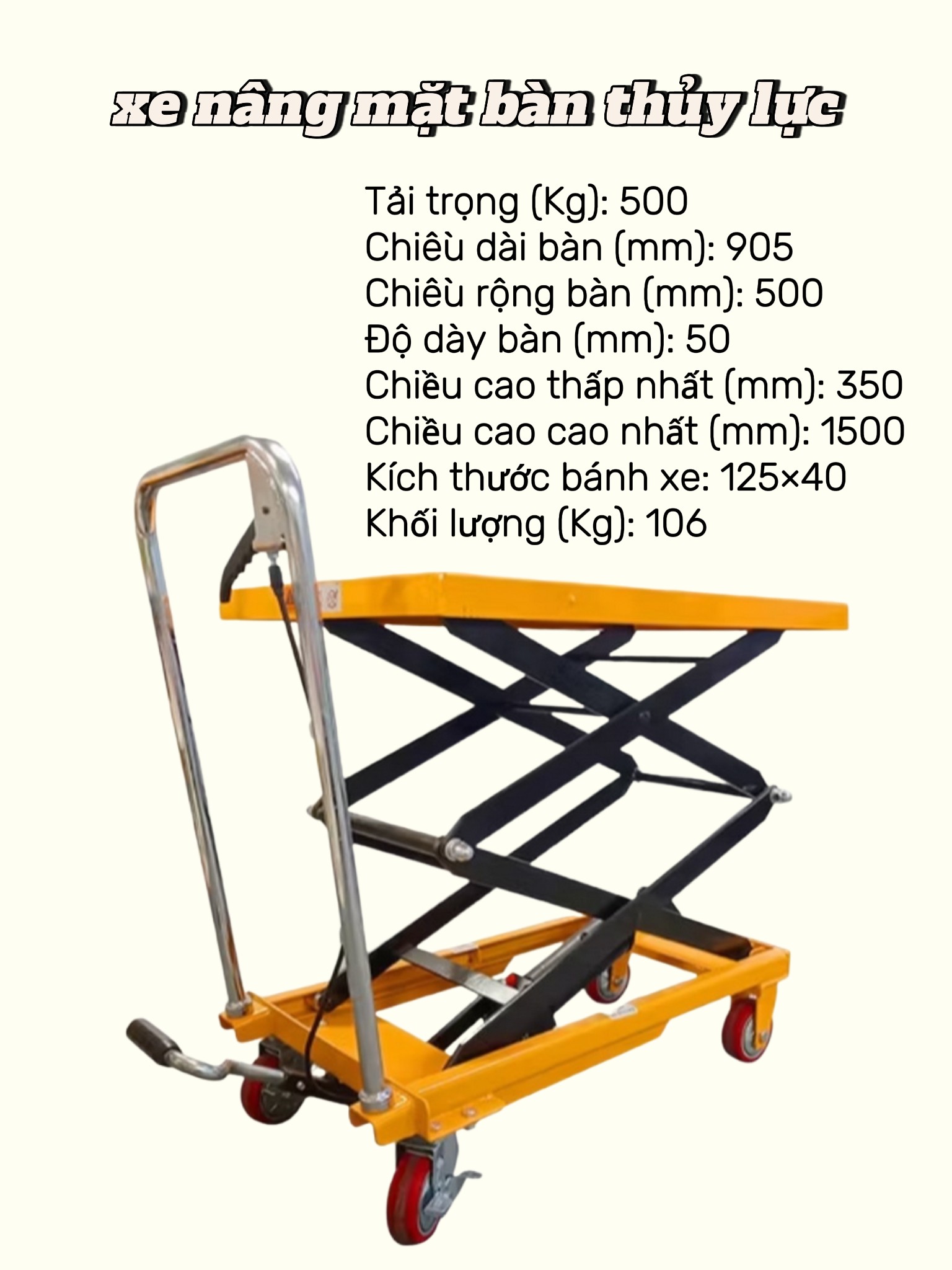 - Xe nâng mặt bàn 500kg có phần tay đẩy chắc chắn được cố định vào khung xe. Người dùng khi bảo quản có thể tháo tay đẩy để tiết kiệm không gian.